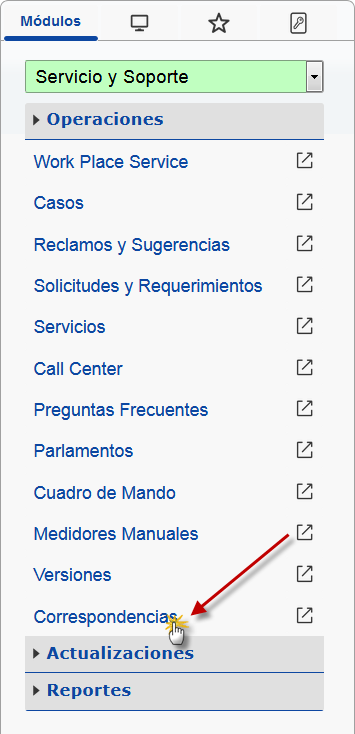 b. En el módulo Servicios y Soporte, desplegamos el componente Operaciones y presionaremos la opción Correspondencias.