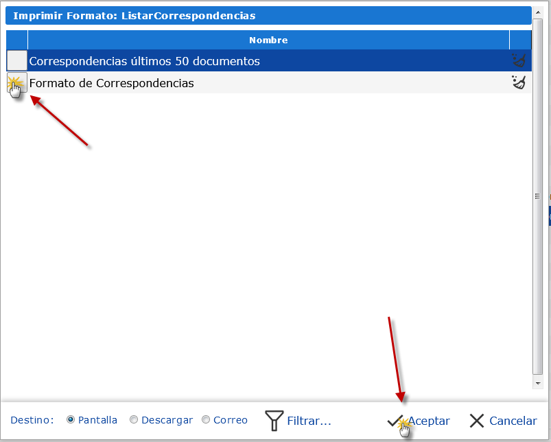 b. Luego de haber presionardo "Imprimir" se nos desplegara un pequeño cuadro en el cual podremos ver los formatos disponibles para este formulario, solo deberemos seleccionar el "Formato de Correspondencias" y presionar
