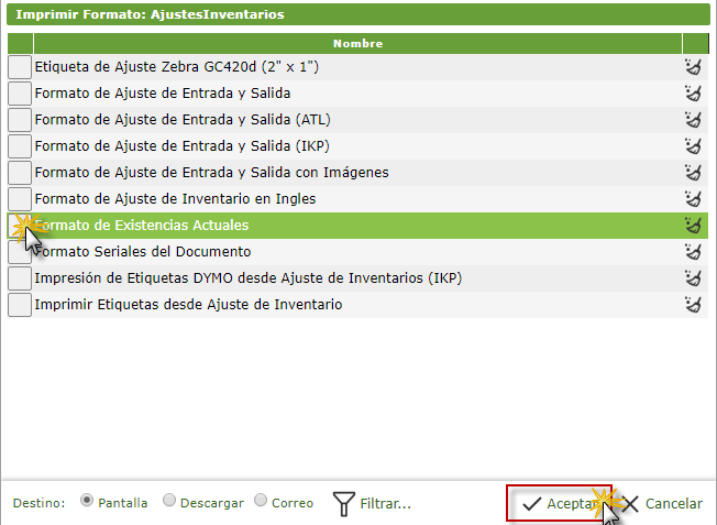 Imprimir Formato: Ajustes Inventarios donde seleccionaremos Formatos de Existencias Actuales y presionaremos el
