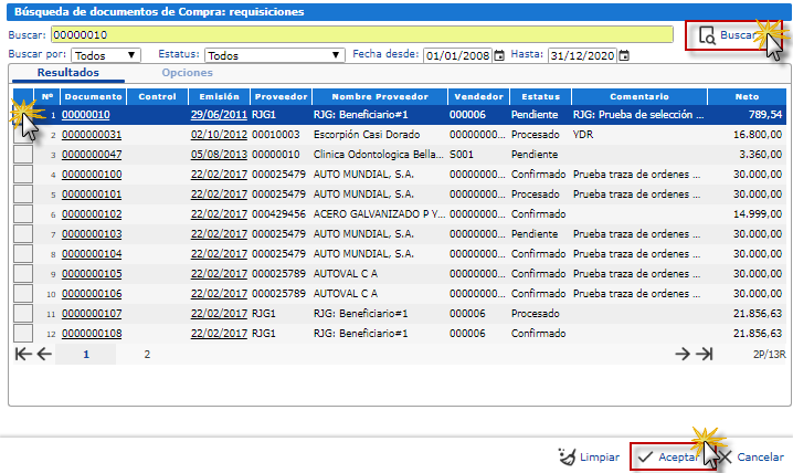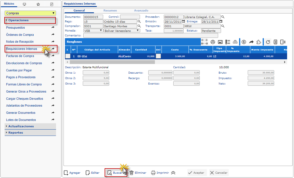 , luego, al encontrar la Requisición, la seleccionamos y presionamos el botón
