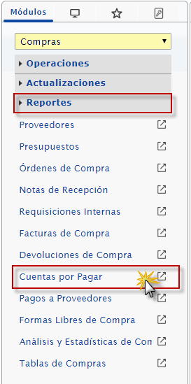 b. En el módulo Compras, desplegamos el componente Reportes, activamos el sub componente Cuentas por Pagar.
