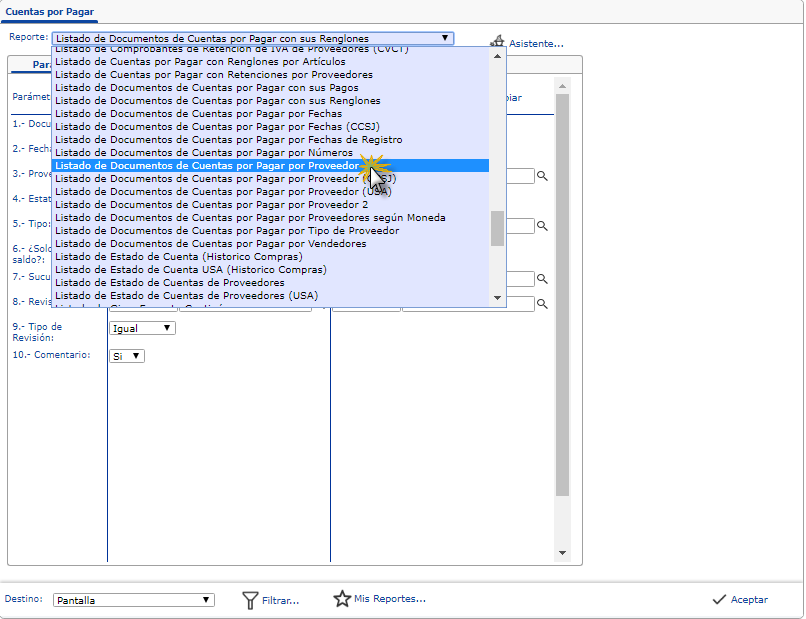 Listado de Documentos de Cuentas por Pagar por Proveedor, especificamos los parámetros necesarios y presionamos el botón