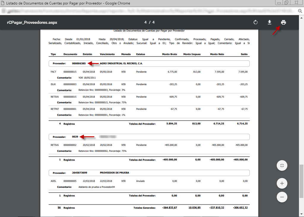 b. Luego de aceptar los parámetros, se muestra en pantalla el Listado de Documentos de Cuentas por Pagar por Proveedor, en el cual vemos los datos agrupados por Proveedor; aquí debemos verificar la información y procedemos a imprimir el documento.
