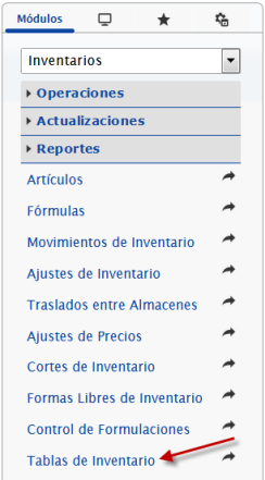 b. En el módulo Inventarios, desplegamos el componente Reportes y activamos el sub componente Tablas de Inventario.