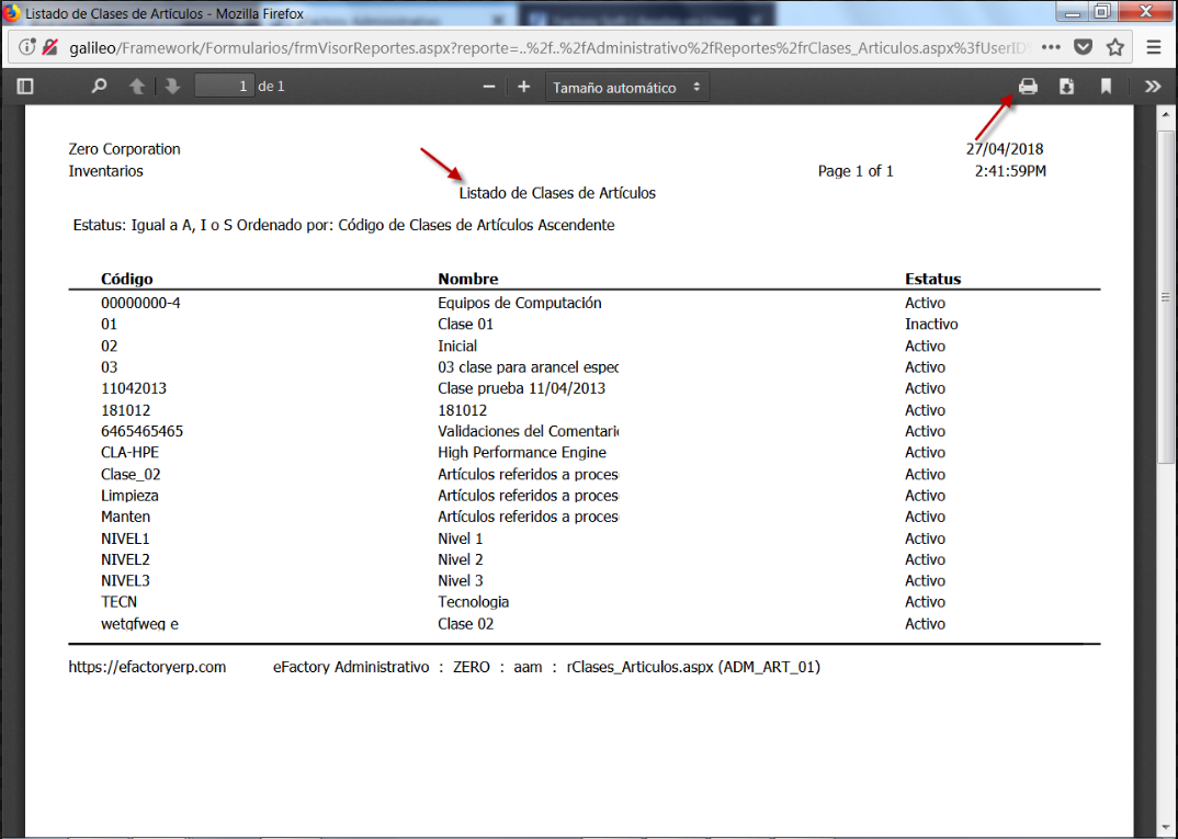 b. Luego de aceptar los parámetros, se muestra en pantalla el Reporte Listado de Clases de Artículos, en el cual observamos las Clases de Artículos registradas; aquí debemos verificar la información y procedemos a guardar o imprimir el documento.