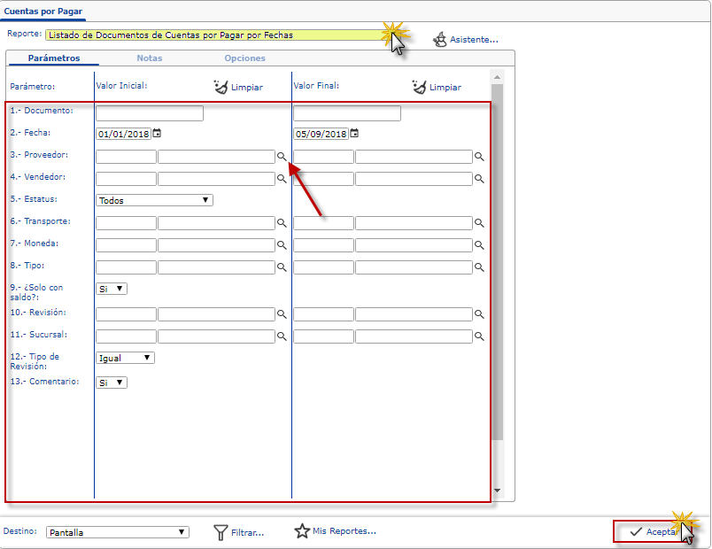Listado de Documentos de Cuentas por Pagar por Fechas, si requerimos filtrar el informe, especificamos los parámetros necesarios como Proveedor, Vendedor, Tipo, Sucursal, entre otros.