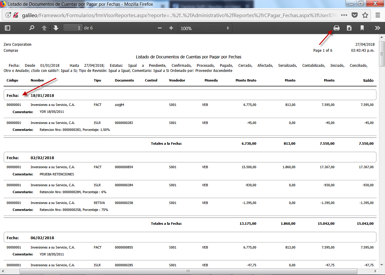 b. Luego de aceptar los Parámetros, se muestra en pantalla el Listado de Documentos de Cuentas por Pagar por Fechas, en el cual vemos los registros agrupados por Fecha; aquí debemos verificar la información y procedemos a guardar el documento como pdf o bien imprimirlo.