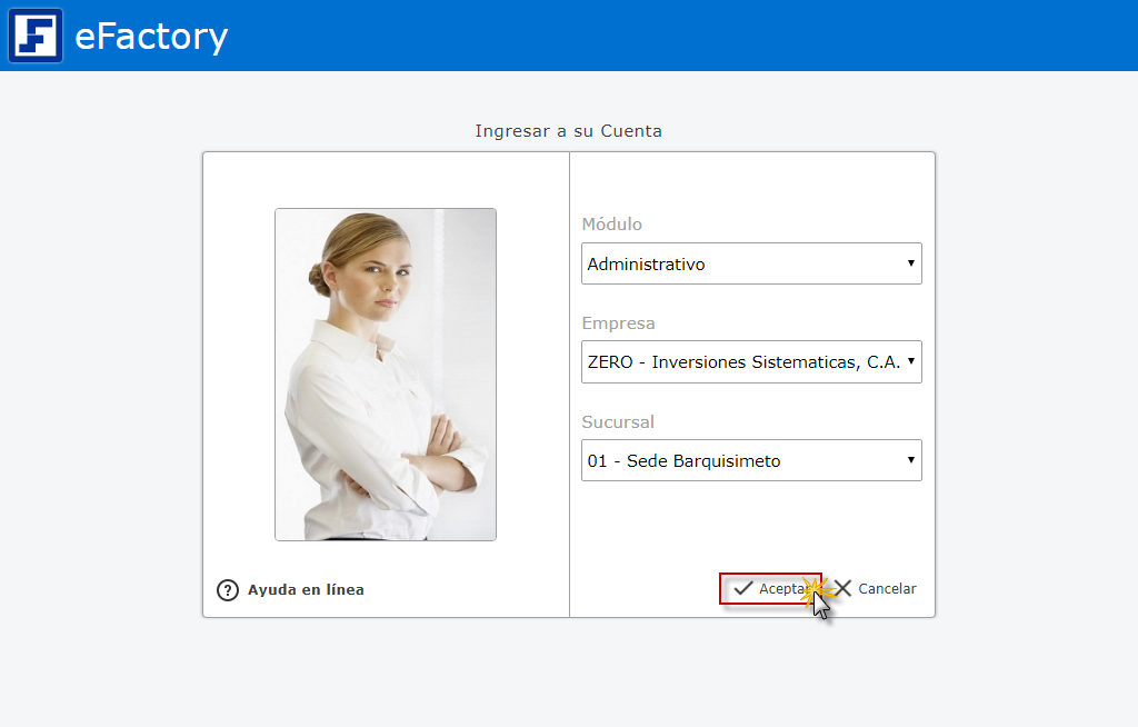 a. Al iniciar en eFactory con nuestro Usuario y Contraseña, Seleccionaremos la Aplicación