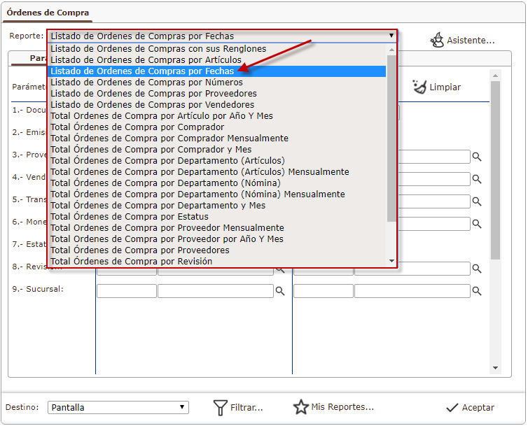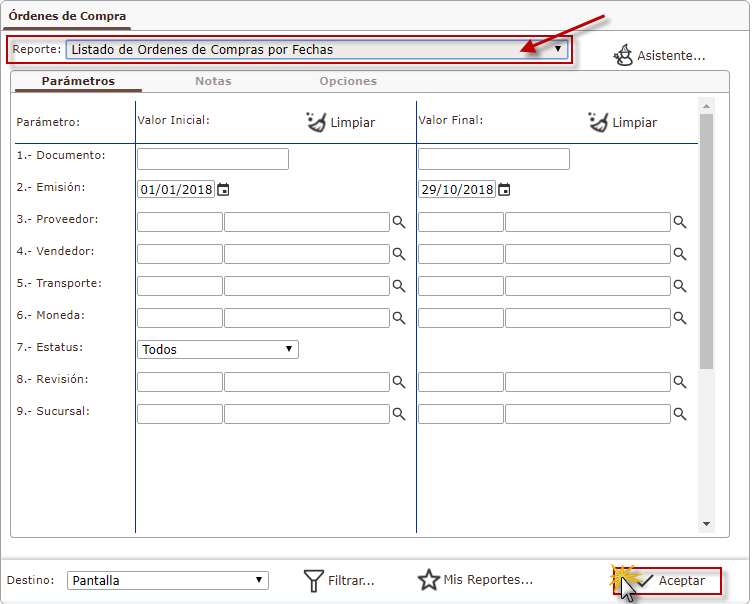 b. Después de haber seleccionado la Órdenes de Compra, procedemos a llenar los campos para generar el reporte de órdenes de compras