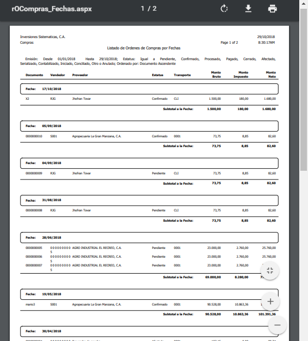 b. Luego se nos muestra el Reporte de Listados de órdenes de Compras generado.