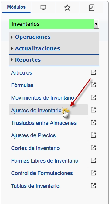 b. En el módulo Inventarios, desplegamos el componente Reportes y activamos el sub componente "Ajustes de Inventario".