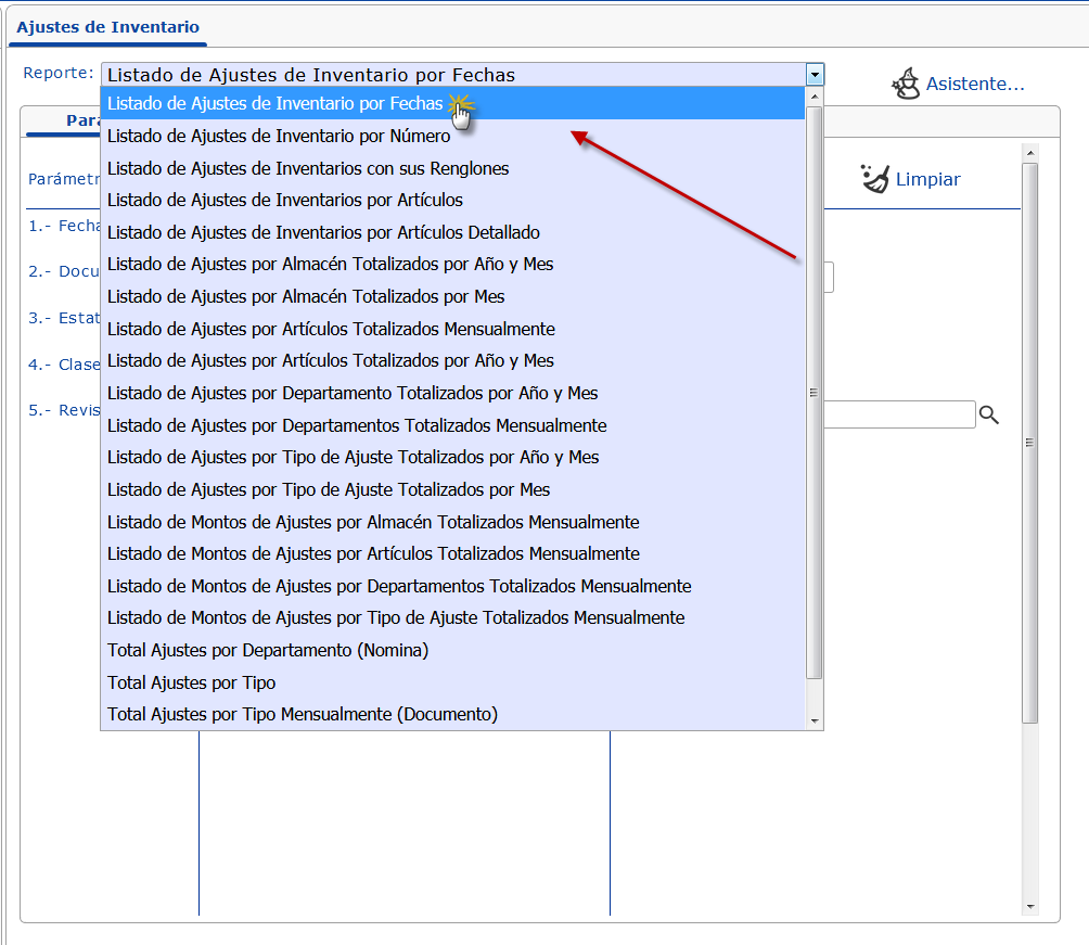 a. Al desplegarse el formulario deberemos desplegar la lista de reportes disponibles y seleccionaremos el reporte "Listado de Ajustes de Inventario por Fechas" luego presionaremos el botón