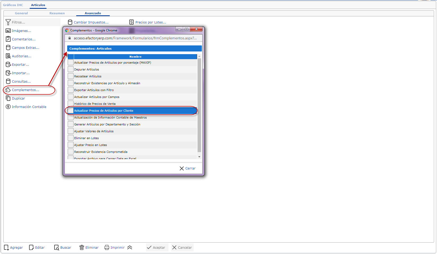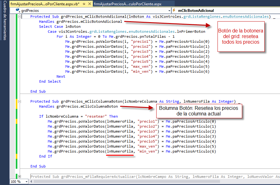 Para ver el detalle del método mCargarPreciosArticulo(), que busca los precios por cliente y los carga en el grid puedes revisar el archivo del complemento en la carpeta correspondiente de eFactory. Los botones del encabezado del grid y de la columna tipo botón se usarán para reestablecer los precios asignados a todos los clientes o al cliente de esa fila, respectivamente, a los valores actuales del precio del artículo seleccionado: