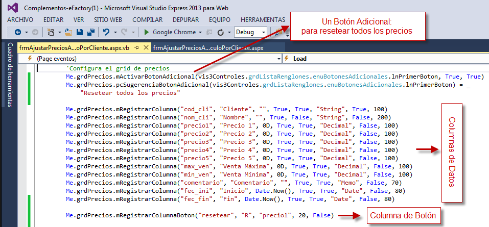 La configuración del grid de renglones requiere que se indique las configuración de cada columna de datos que se desea mostrar. Para el complemento de ejemplo también se agregó un botón adicional en la botonera del grid, que se usará para reestablecer al valor original los precios del artículo seleccionado para todos los renglones. También se configuró una columna de tipo botón para hacer lo mismo con cada renglón de forma adicional.