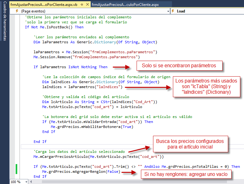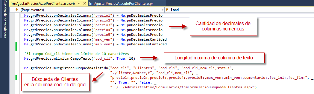 En el evento LOAD del formulario se realiza la configuración inicial de los controles, y se reciben los parámetros enviados por el formulario de origen (en este caso el formulario de Artículos). Veamos la configuración de la caja de búsqueda: