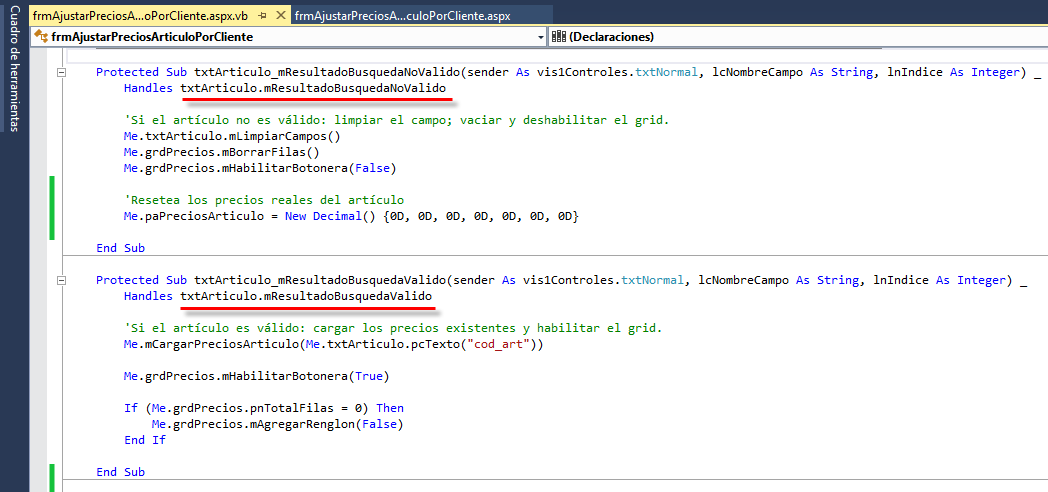 Cuando el usuario abre el formulario por primera vez, se mostrarán los precios por cliente configurados para el artículo que tenía seleccionado en el formulario de Artículos al momento de abrir este complemento desde allí. Si el usuario selecciona en el complemento un artículo diferente en la caja de búsqueda, ya sea mediante el botón de búsqueda o escribiendo el código manualmente, se mostrarán los precios configurados para ese artículo. Esto se hace programando el evento mResultadoBusquedaValido de ese control; adicionalmente, el evento mResultadoBusquedaNoValido> se usará para borrar el contenido del grid cuando el usuario ingrese un código de artículo no válido; veamos: