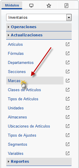 b. En el módulo Inventarios, desplegamos el componente Actualizaciones y activamos el sub componente Marcas.
