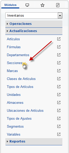 b. En el módulo Inventarios, desplegamos el componente Actualizaciones y activamos el sub componente Secciones.
