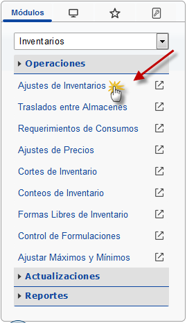 b. En el módulo Inventario, desplegamos el componente Operaciones y activamos el sub componente Ajustes de Inventario