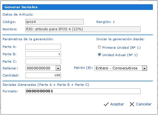 c. Luego de esto veremos que se nos despliega un pequeño recuadro, este es el asistente de generación de seriales de entrada y se compone por las opciones: