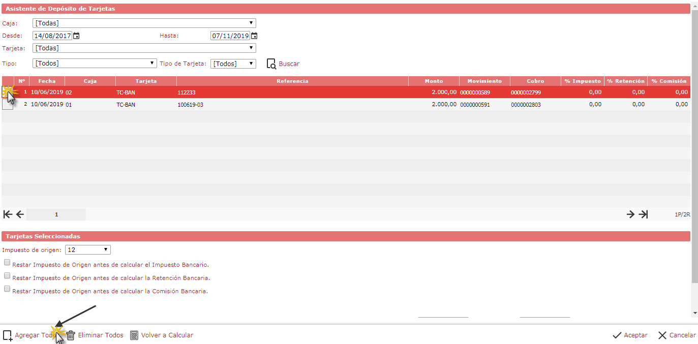 donde se mostrará la ventana de Asistente de Depósitos de Tarjetas.