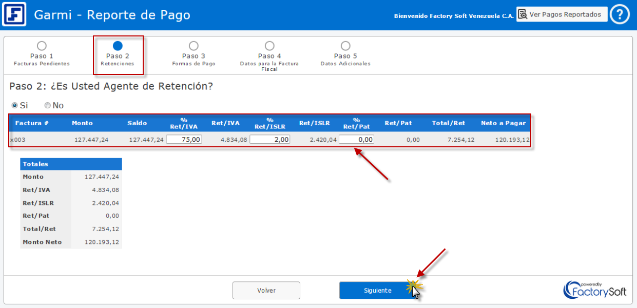 el porcentaje de IVA, ISLR y Patente a retener para cada factura y también se puede observar las modificaciones al monto total por pagar, con sus retenciones.