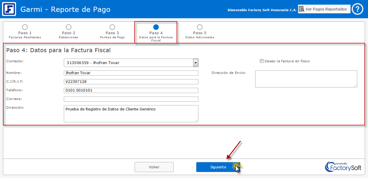 También podemos obtener la factura en físico activado la casilla Deseo la factura en físico y detallado la dirección de Envío. Luego seleccionaremos el cuadro que se encuentra en la pantalla, luego presionaremos el botón