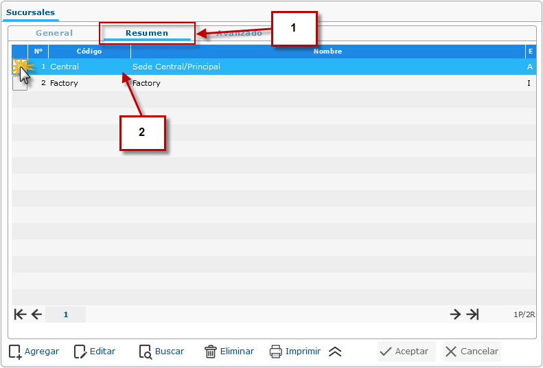 a. Luego de haber seleccionado la opción de Sucursales se muestra la pantalla donde presionaremos la ficha Resumen para buscar