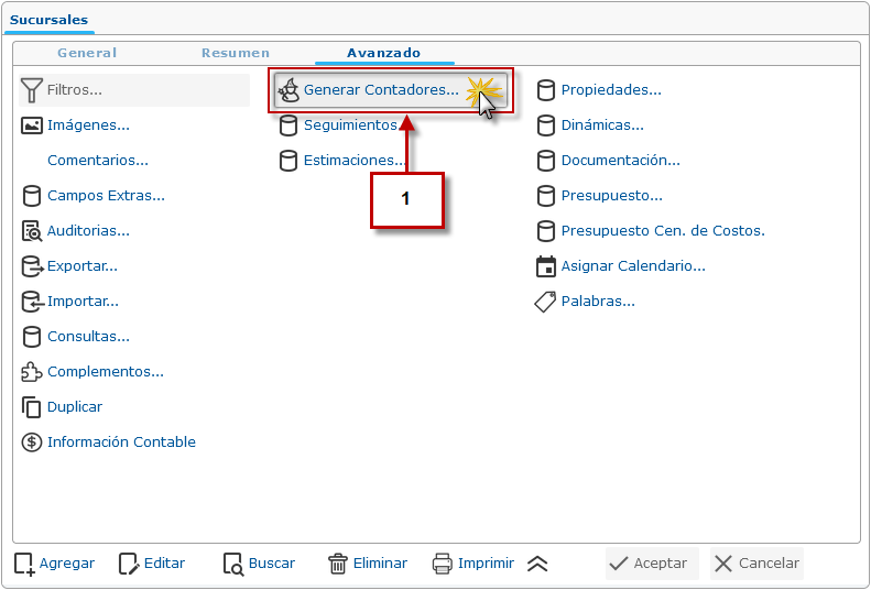a. Despues de generar los Contadores de la Sucursal es necesario configurarlos, para esto procedemos a hacer clic nuevamente en la pestaña Avanzado