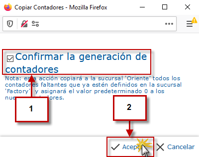 se abrirá la pantalla Copiar Contadores, en la que debemos activar la casilla Confirmar la generación de contadores