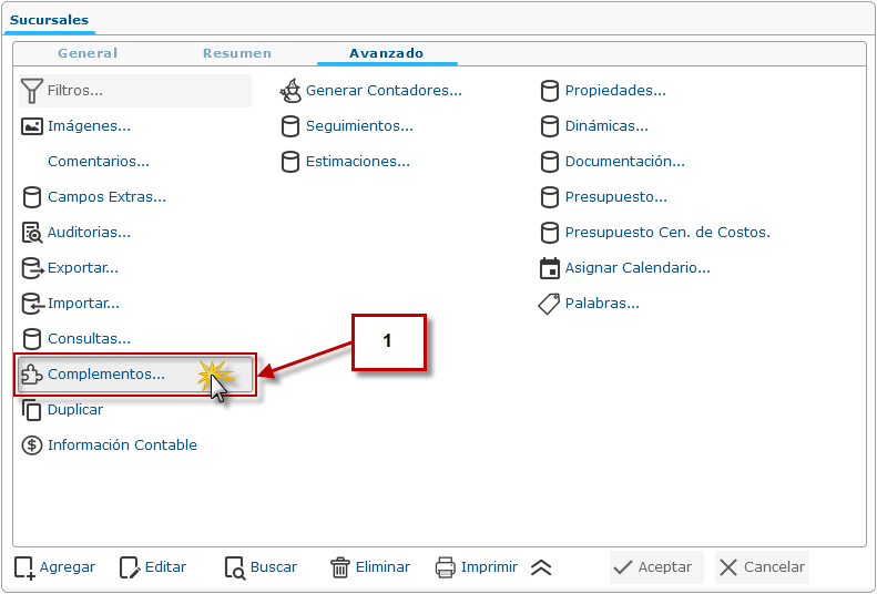 a. Al registrar la nueva Sucursal procedemos a hacer clic nuevamente en la pestaña Avanzado y allí pulsar el botón