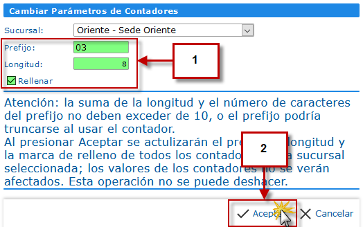 c. Al hacer clic en Cambiar Parámetros de Contadores se abrirá la pantalla Cambiar Parámetros de Contadores, en la que debemos asignar un Prefijo, una longitud para el contador y activar la casilla Rellenar