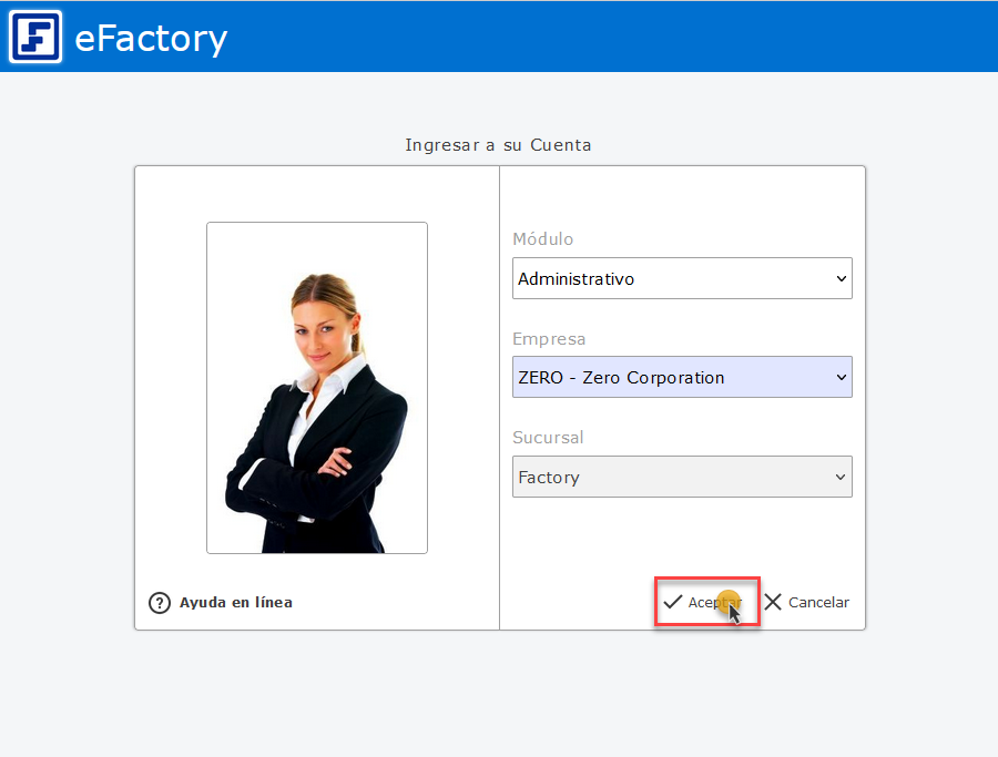 Primero debemos ingresar al sistema de eFactory colocando nuestro usuario y contraseña en la pantalla inicial de eFactory, luego presionaremos el botón de