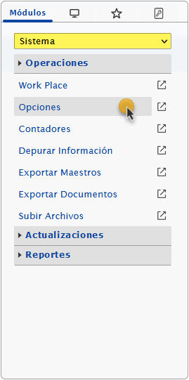 a. Para esto debemos seleccionar el módulo Sistema y al desplegar la sección de Operaciones seleccionaremos la opción de Opciones.