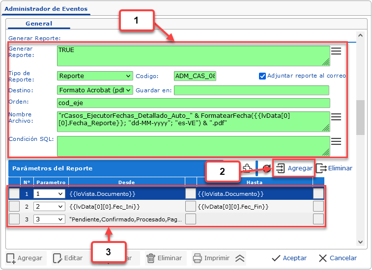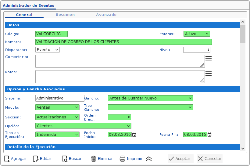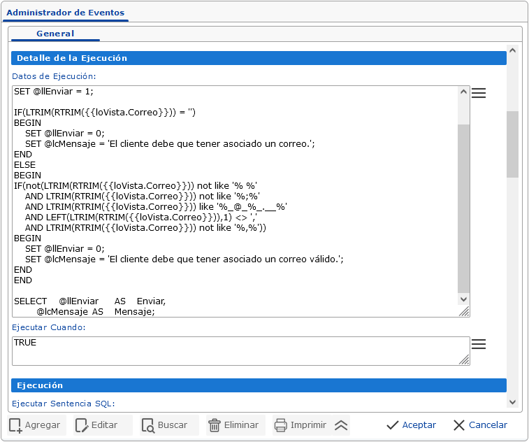 3. En la sección de Detalle de Ejecución: Se define el código que consultará los datos que serán utilizados por el evento y a su vez se define la condición de ejecución del mismo.