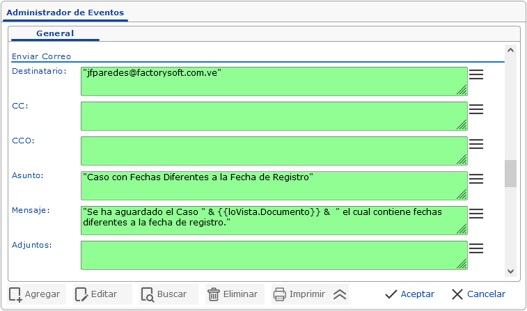 .- La tarea Enviar Correo permite enviar un correo automático a los destinatarios. Esta sección admite expresiones LIF en todos sus campos, para poder utilizar los datos obtenidos por la consulta del evento. Esta tarea cuenta con los campos: