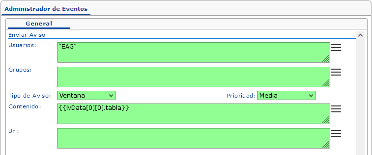 De la misma forma podemos crear el contenido del aviso en la consulta del evento y enviarlo en forma de parámetro a este campo, por ejemplo: