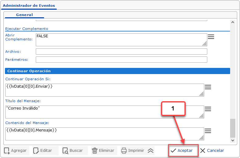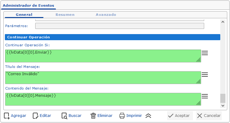 {{lvData[0]}}.5. En la sección de Continuar Operación: Se definen las condiciones que permitirán o no continuar con el proceso del formulario en el que se ejecutó el evento. Por ejemplo, si el evento se ejecuta con el gancho Antes de Confirmar y en la sección Continuar Operación se devuelve un valor FALSE, el documento no se confirmará y mostrará el mensaje indicado en esta sección.