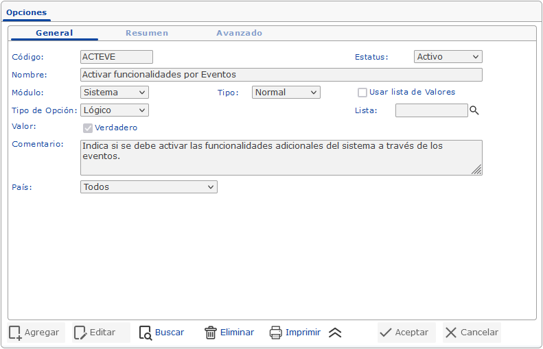 Las opciones globales son aquellas creadas desde la pantalla de Opciones, en el módulo de Sistemas.