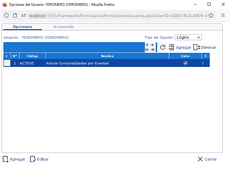 Las opciones de usuarios son aquellas creadas desde la pantalla de Opciones del Usuario, en el formulario de Usuarios Globales, ficha Avanzados.
