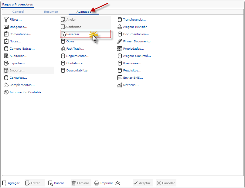 Una vez Reversado el Adelanto de Pago, Tenemos la posibilidad de Anular el Documento o también acceder a Complementos para Eliminar o Actualizar Datos del Movimiento, estas opciones se encuentran también en la pestaña Avanzado y se explican a continuación:
