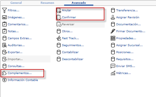 Contamos también con herramientas adicionales para editar nuestro Adelanto de Pago, a las cuales accedemos, en la pestaña Avanzado, mediante el botón Complementos, se mostrará una ventana con los complementos disponibles, los cuales se explican: