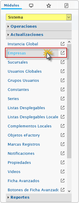 a. Al ingresar en el sistema debemos seleccionar el módulo Sistema y al desplegar la sección de Actualizaciones seleccionaremos la opción de Empresas.