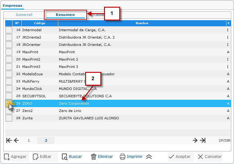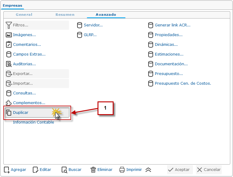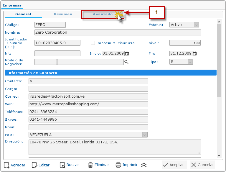 a. Al seleccionar la Empresa procedemos a hacer clic en la pestaña Avanzado.