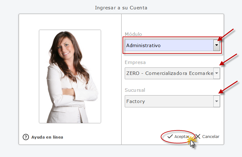 "Iniciar Sección", luego seleccionaremos el sistema "Administrativo" la empresa