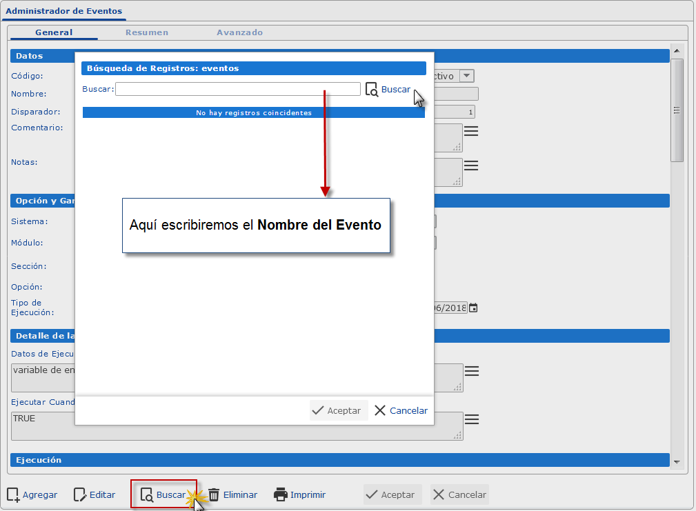 ; donde nos permitirá Localizar el Evento.
