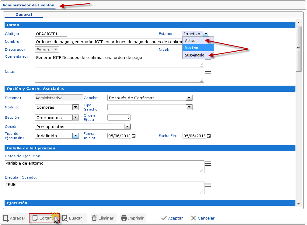 Veamos el proceso para suspender o activar un evento de manera rápida y sencilla.