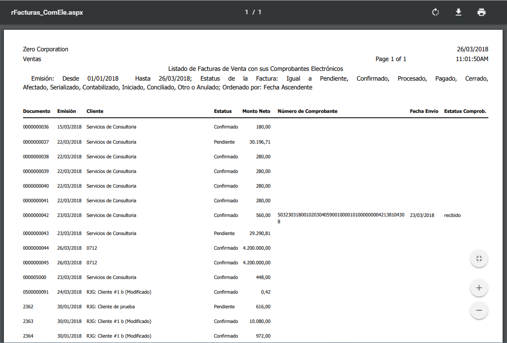 b. Los comprobantes enviados con cada facturas de venta se podrán ver a través de un reportes "Listado De Facturas de Venta con sus Comprobantes Electrónicos", este se encuentra en el modulo de "Ventas" en la seccion de "Reportes" en la opción "Facturas de Venta".