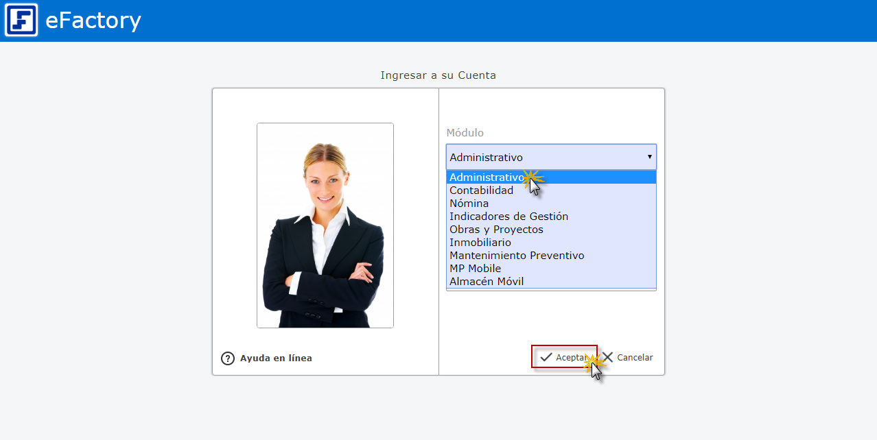 a. Para iniciar en eFactory debemos ingresar con nuestro Usuario y Contraseña, seleccionaremos la aplicación Administrativo, Empresa y Sucursal de la Empresa y presionamos el botón