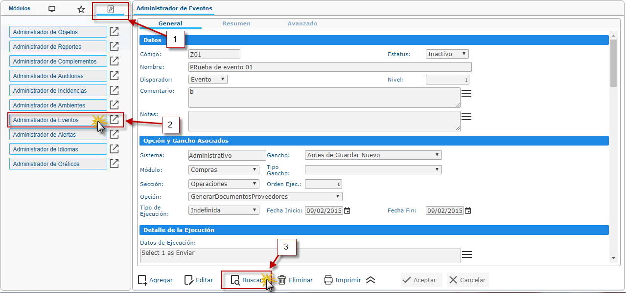 , después Administrador de Eventos y presionaremos el botón